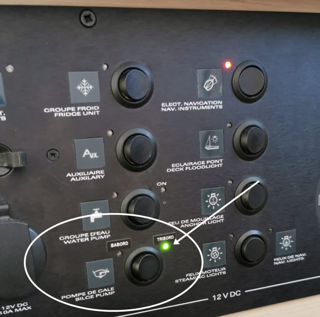 Die Yacht ist mit 1 manuellen und 1 automatischen Bilgenpumpe ausgestattet. Sollte sich einmal Wasser ansammeln, wird dieses von der automatischen Pumpe abgepumpt. Diese muss am Schaltpult, wie unten beschrieben, eingeschaltet werden. Sollte die Pumpe im Notfall nicht automatisch arbeiten, kann auch manuell eintretendes Wasser abgepumpt werden (Anleitung siehe unten). Das Werkzeug für die manuelle Pumpe befindet sich in der Backskiste (Plicht)
