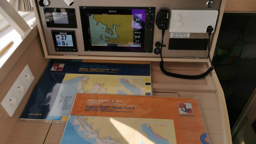 Papierkarten befinden sich im Navigationspult / Navigation charts are stored in navigation table.