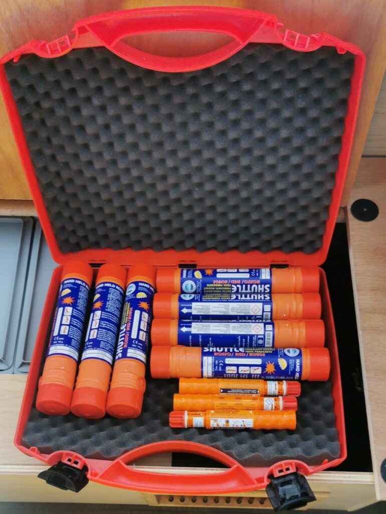 - Seenotsignale: Fackeln, Rauchtöpfe, Fallschirmraketen gem. Vorschrift, Stauraum Salon unter den Sitzbänken / pyrotechnics, parachute rockets, according to regulations, salon storage under seats