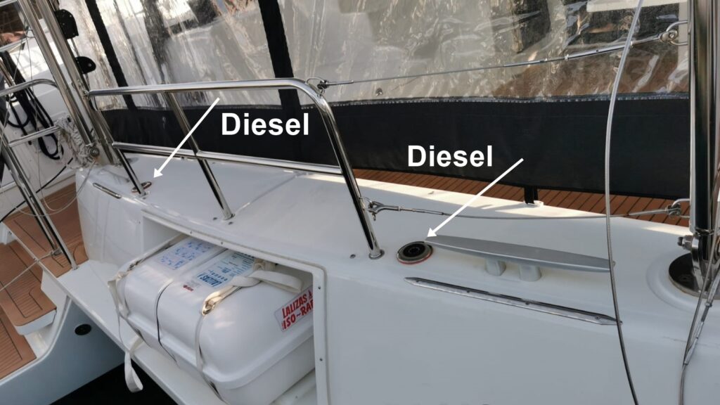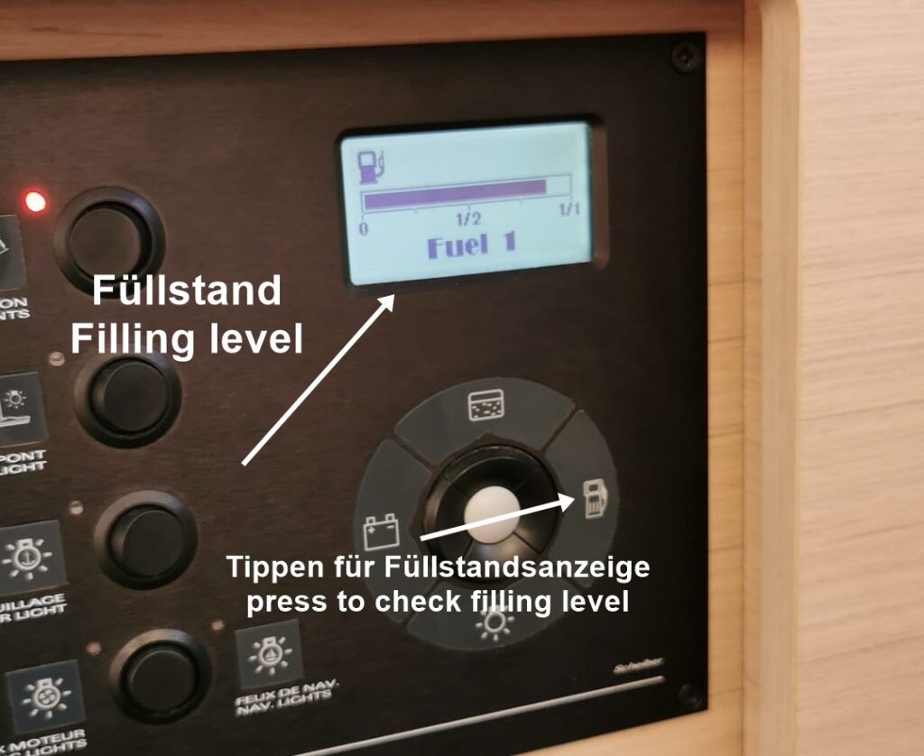 Position Tanköffnung: Tank 1 / Tank 2 jeweils am Heck, oberhalb der Rettungsinsel. Inhalt jeweils 175 Liter. Der Füllstand beider Tanks kann am Bedienpanel innen abgerufen werden.