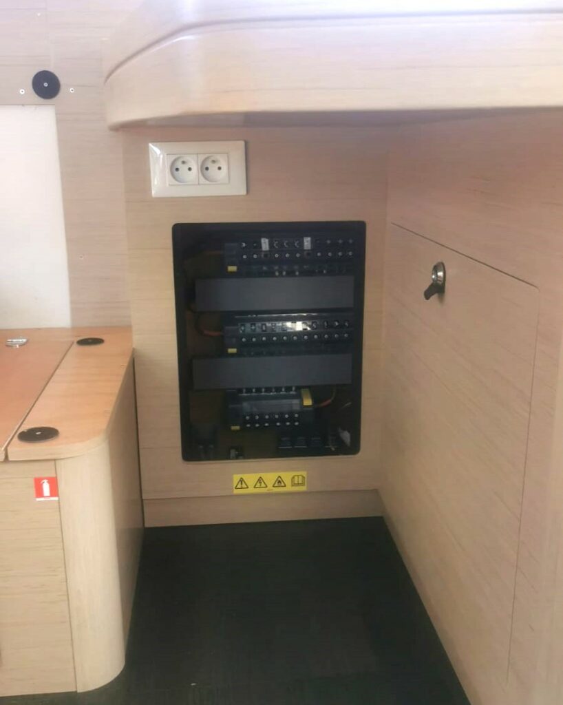 The control panel for the consumers is located in the companionway on the right /starboard side. Futuna Lima has 3 fuse boxes. These are located in the saloon, under the navigation table (1) and in the master cabin, on the right in the cupboard by the entrance (2,3). Switch on the required consumers here, e.g. water pumps, lighting such as top light and interior lighting or refrigerator.