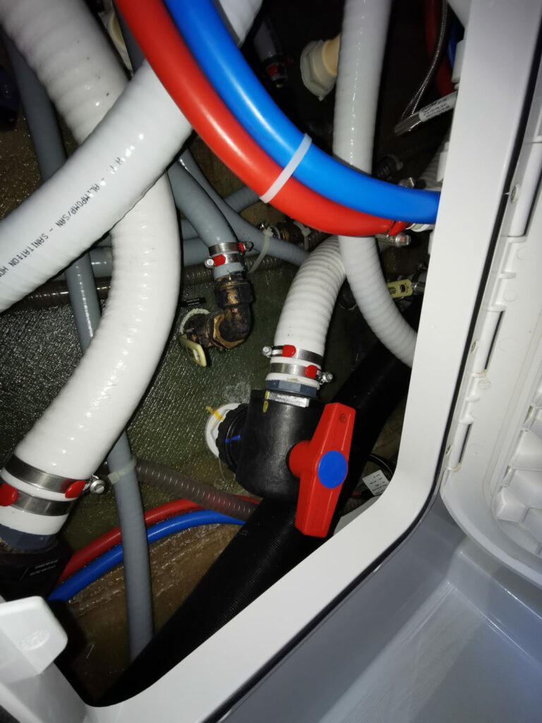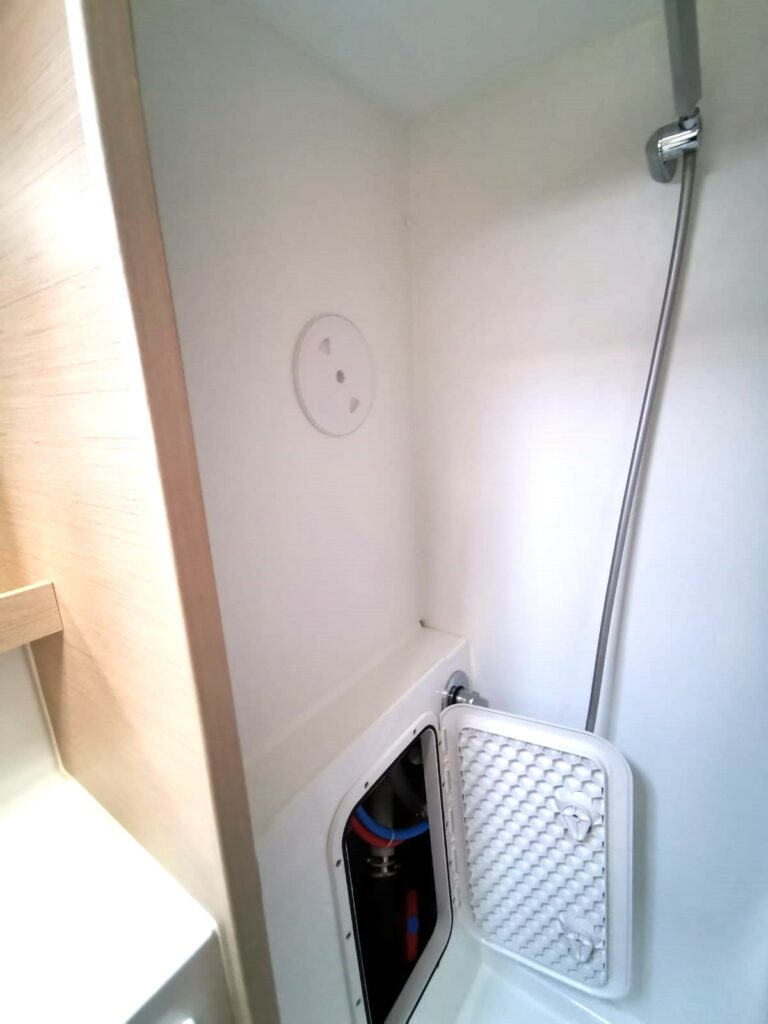 Um die Schwarzwassertanks zu entleeren, muss die Revisionsklappe in der Dusche geöffnet werden. Dahinter befinden sich die Ventile für die Schwarzwasser-Tanks. Bitte beachten Sie, dass die Schwarzwassertanks bei Rückkehr in die Marina leer sein müssen. -INFORMATION-