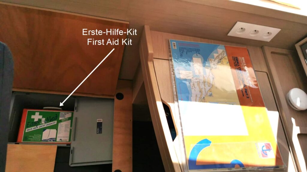 - Erste-Hilfe-Kit / First aid kit: 1 Stk/pcs, Salon, unter der Sitzgelegeneheit am Naviagationstisch / First aid kit is located in salon, beneath sofa next to navigation station.
