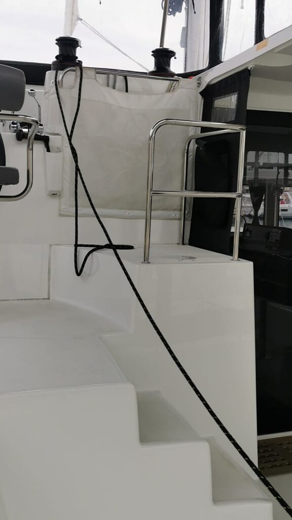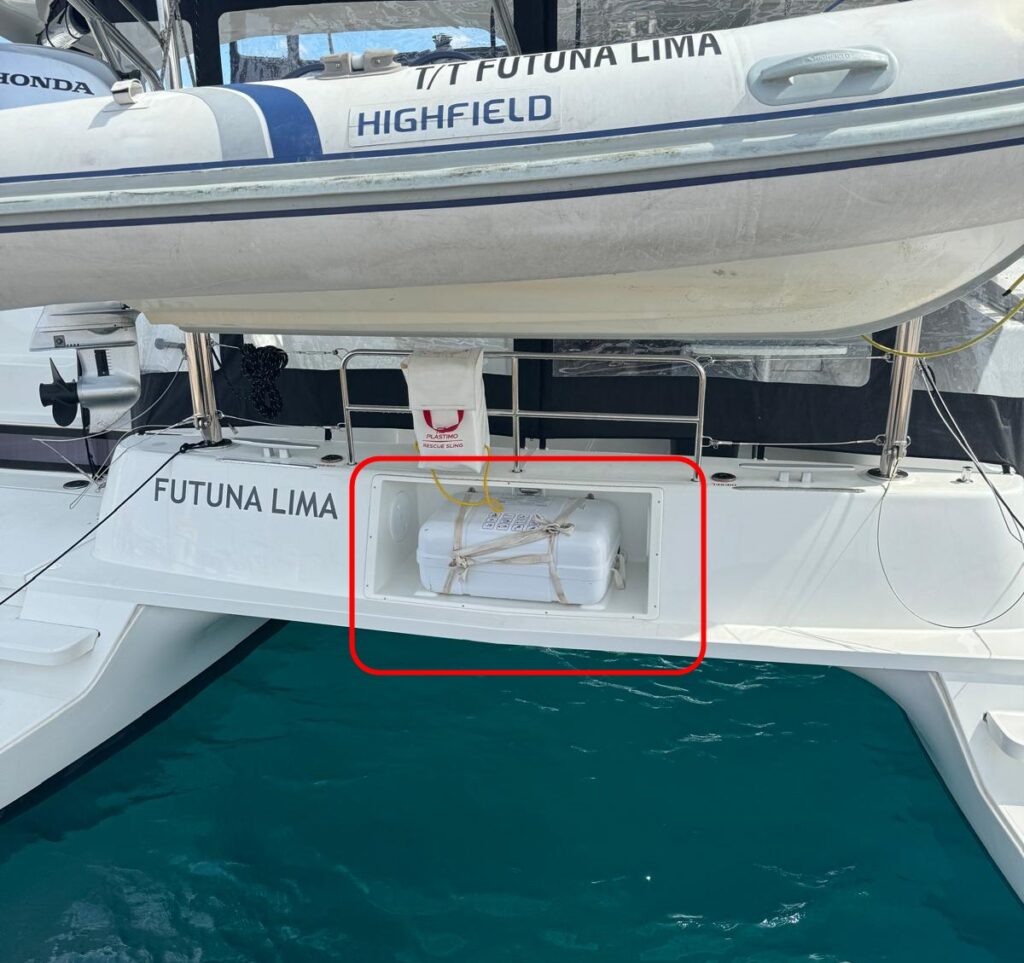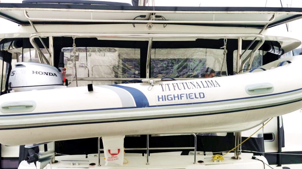 Die Futuna Lima verfügt über ein Highfield Beiboot mit einem 15 PS Honda Motor. Das Beiboot sollte immer über die Winsch (1) herab gelassen und herauf gezogen werden. Benzinhahn (2) muss geöffnet werden, Notstop (3) (rotes Spiralkabel) muss eingesetzt sein.