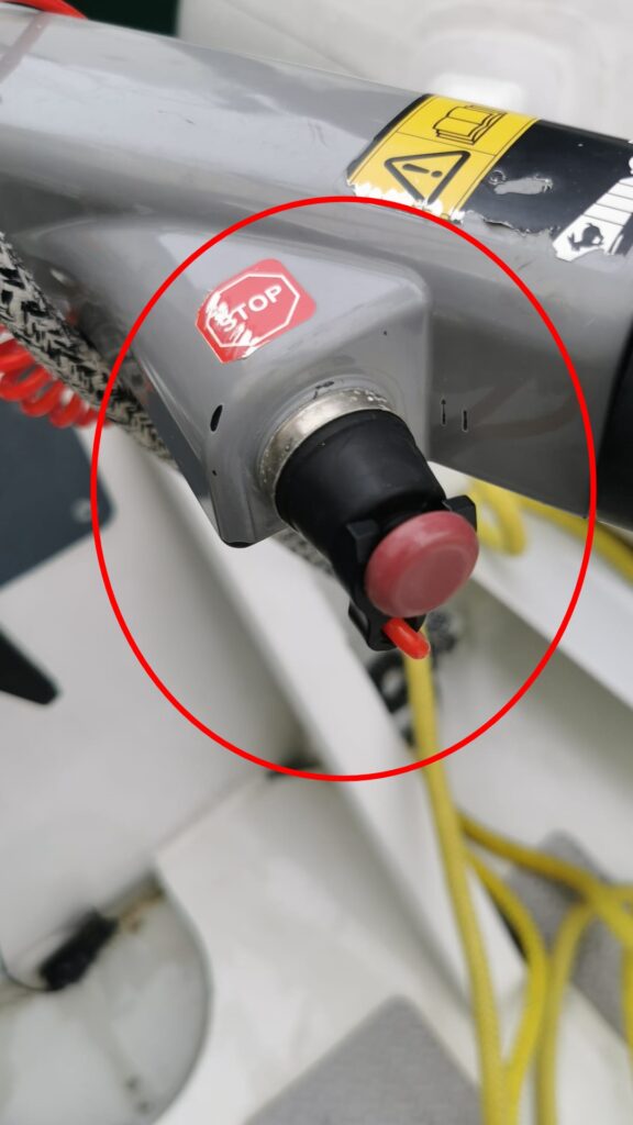 Futuna Lima has a Highfield dinghy with a 15 hp Honda engine. The dinghy should always be lowered and raised by using the winch (1). Fuel tap (2) must be opened, Quickstop (3) (red spiral cable) must be inserted.