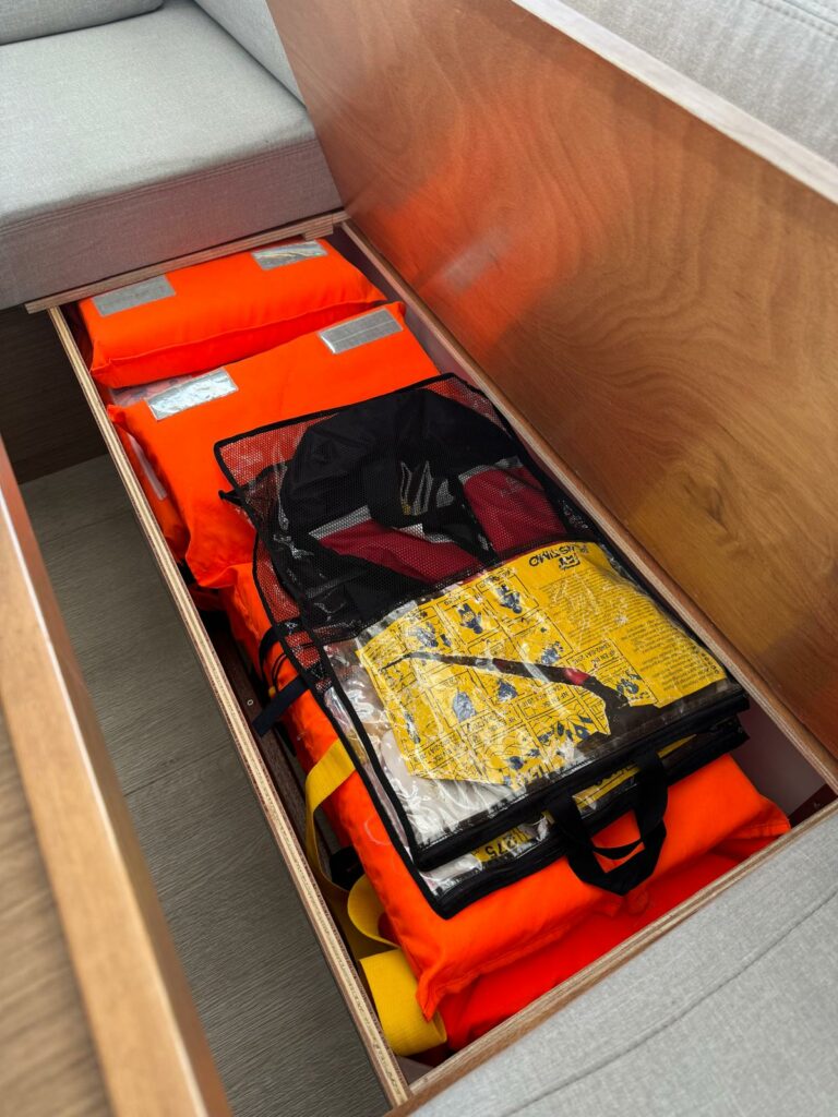 - Rettungswesten / life vests: 10 Stück Stauraum Sitzbank Salon / 10pcs inside salon storage under seats