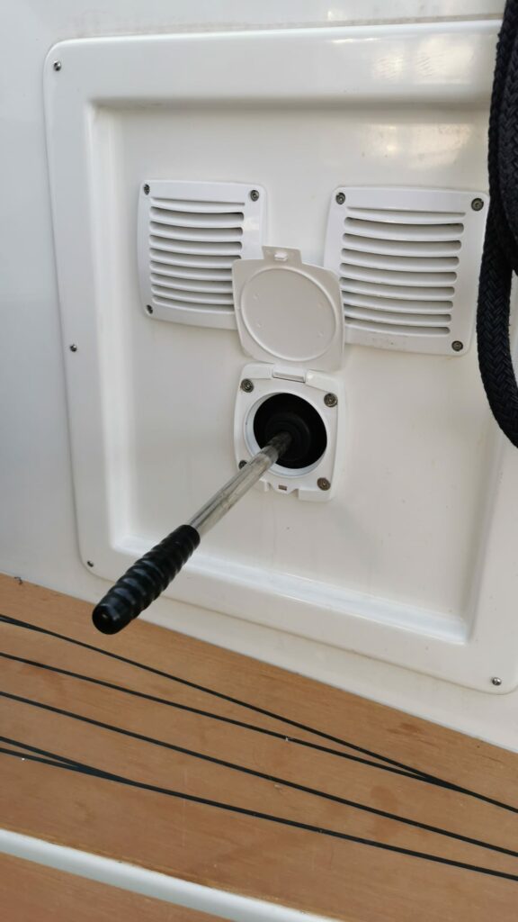Sollte die Pumpe im Notfall nicht automatisch arbeiten, kann auch manuell eintretendes Wasser abgepumpt werden. Die Handhebel befinden sich in der Backskiste und werden in die entsprechende Vorrichtung am Heck eingesetzt. Das Wasser in der Bilge wird per Pumpbewegung mit dem Handhebel abgepumpt.