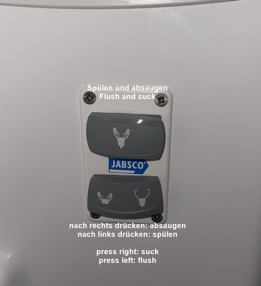 Sailing Breeze has 3 electric toilets. Operation via the electric switches. Top switch: flush and suction at the same time, bottom switch press to the right -> suction, press to the left > flush.