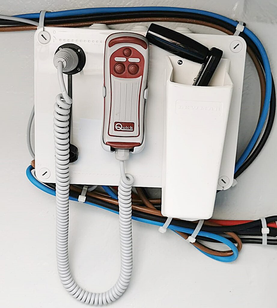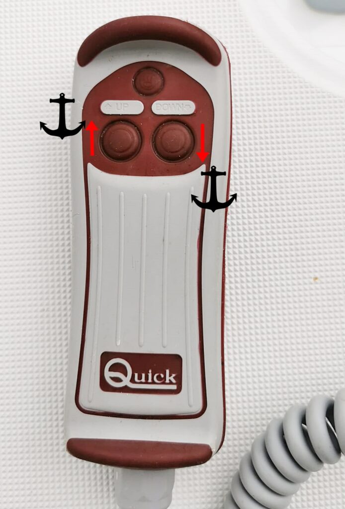 The anchor is operated via the remote control. This is positioned in the anchor box. Open the anchor locker and remove the remote control. Right button -> lower anchor. Left button -> Raise anchor.