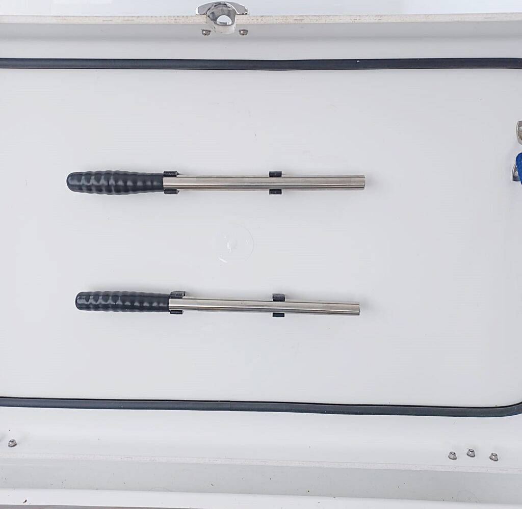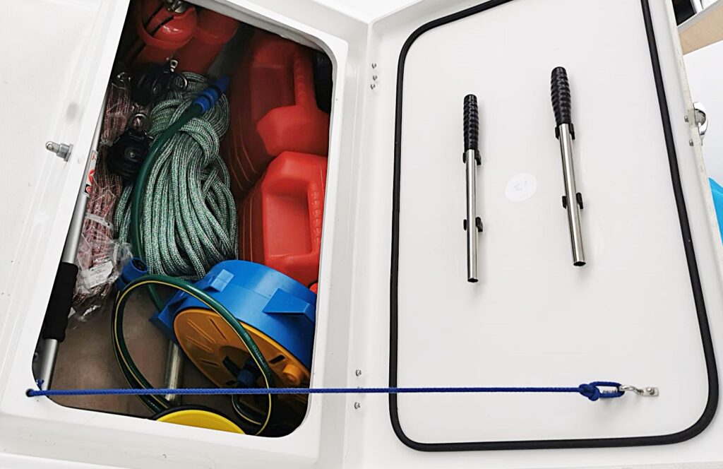 If the pump does not work automatically in an emergency, water that enters can also be pumped out manually. The hand levers are located in the locker and are inserted into the corresponding device at the stern. The water in the bilge is pumped out by pumping with the hand lever.