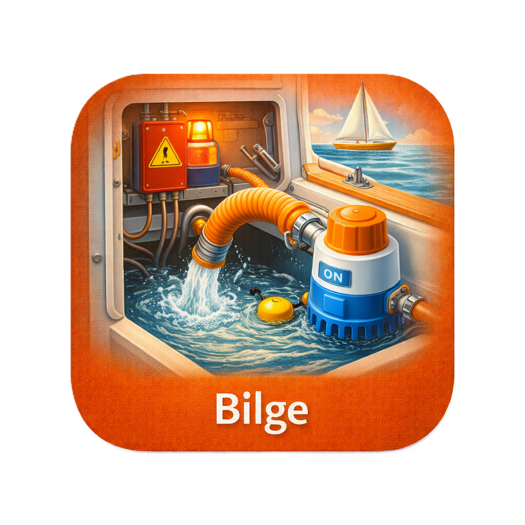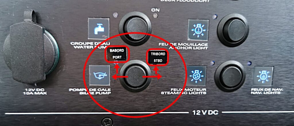 Die Yacht ist mit 1 manuellen und 2 automatischen Bilgenpumpe ausgestattet. Sollte sich einmal Wasser ansammeln, wird dieses von der automatischen Pumpe abgepumpt. Diese muss am Schaltpult, wie unten beschrieben, eingeschaltet werden. Die automatischen Pumpen befinden sich jeweils im Schwimmer Steuerbord und Backbord, unter dem Bodenpanel.