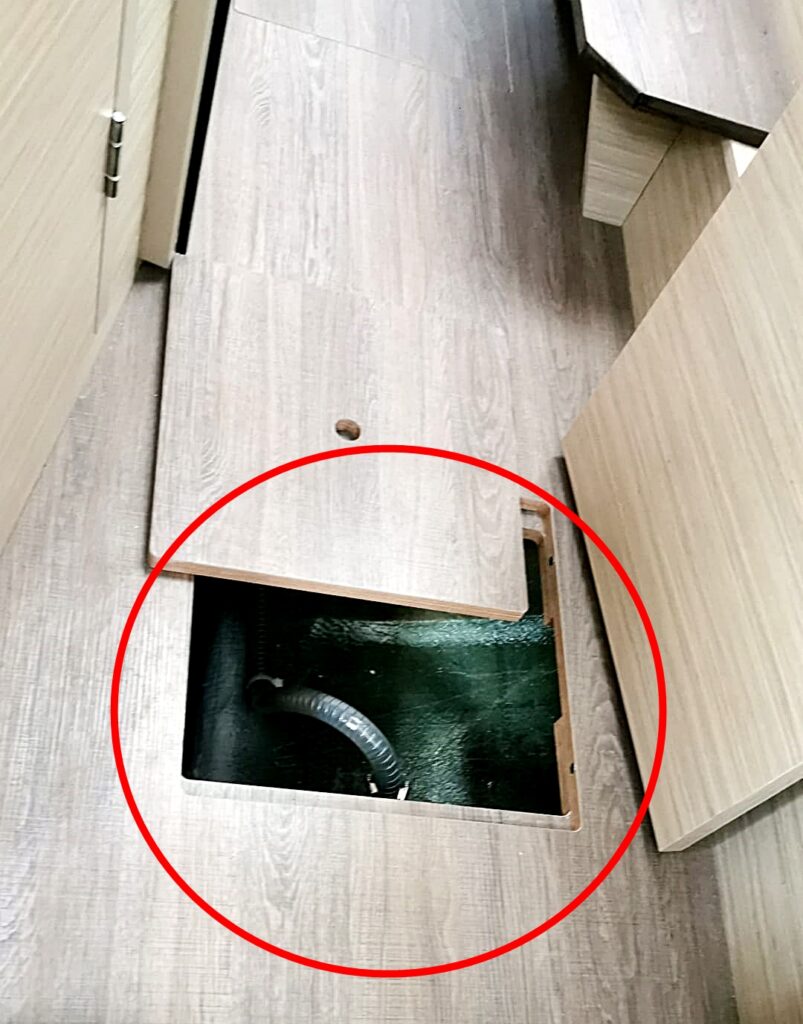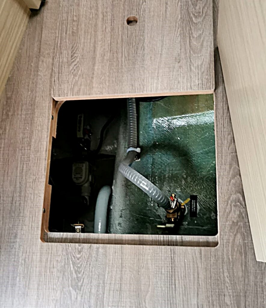 To empty the 3 black water tanks, the inspection flap in the shower must be opened. Behind it are the valves for the black water tanks located. 1 in each cabin / toilet.