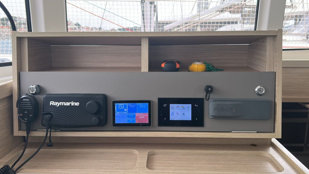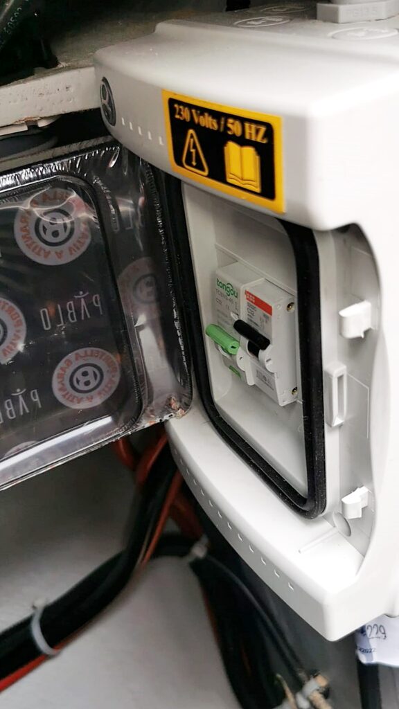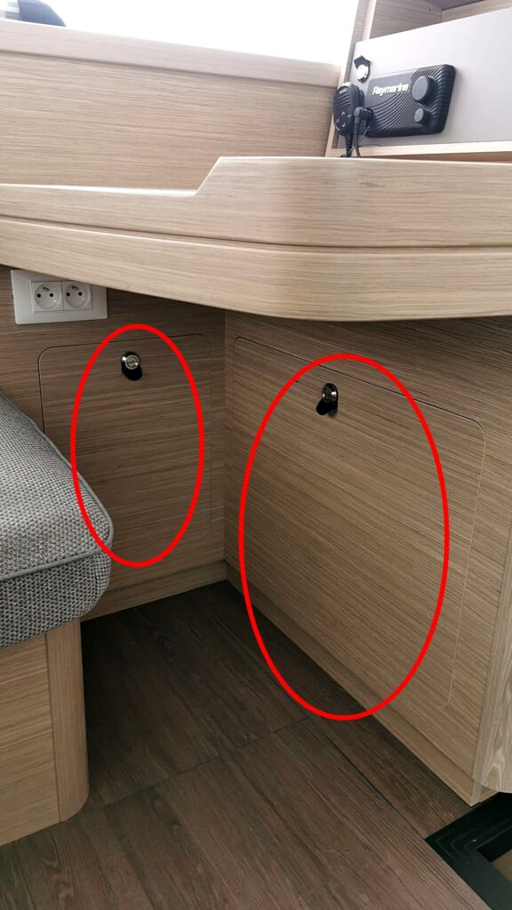 Die Sailing Breeze hat 3 Sicherungskästen. Diese befinden sich im Salon, unter dem Navigationstisch (1) und in der Master-Kabine, rechts im Schrank am Eingang (2,3). Schalten Sie hier die benötigten Verbraucher wie z.B. Wasserpumpen, Beleuchtung wie Top-Licht und Innenbeleuchtung oder Kühlschrank ein.
