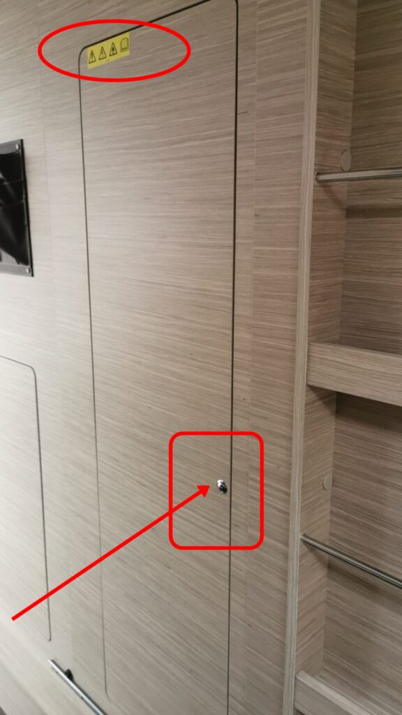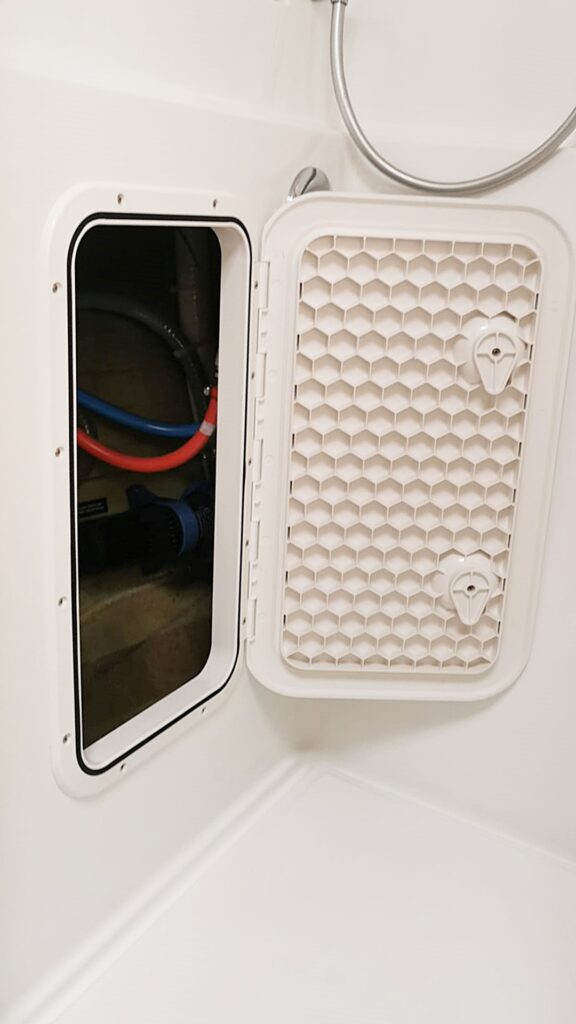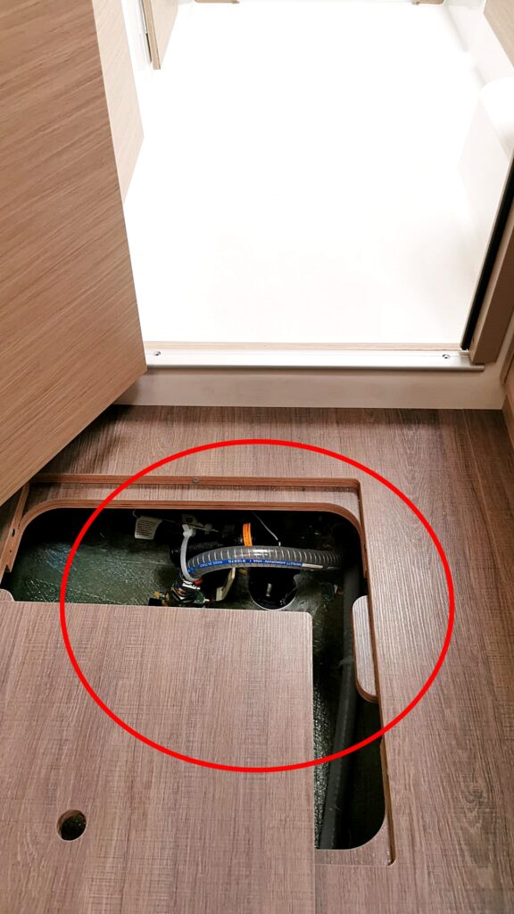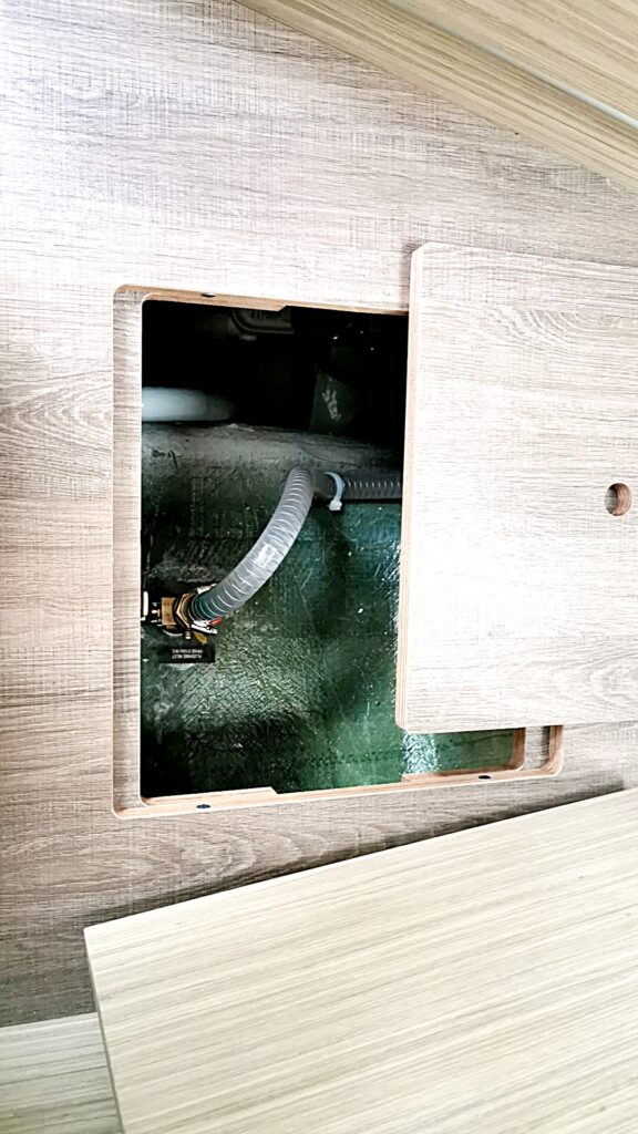 Um die 3 Schwarzwassertanks zu entleeren, muss die Revisionsklappe in der Dusche geöffnet werden. Dahinter befinden sich die Ventile für die Schwarzwasser-Tanks. Jeweils 1 in jeder Kabine / WC.
