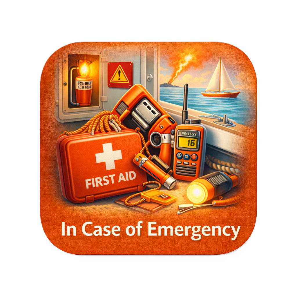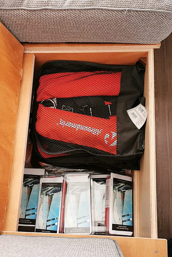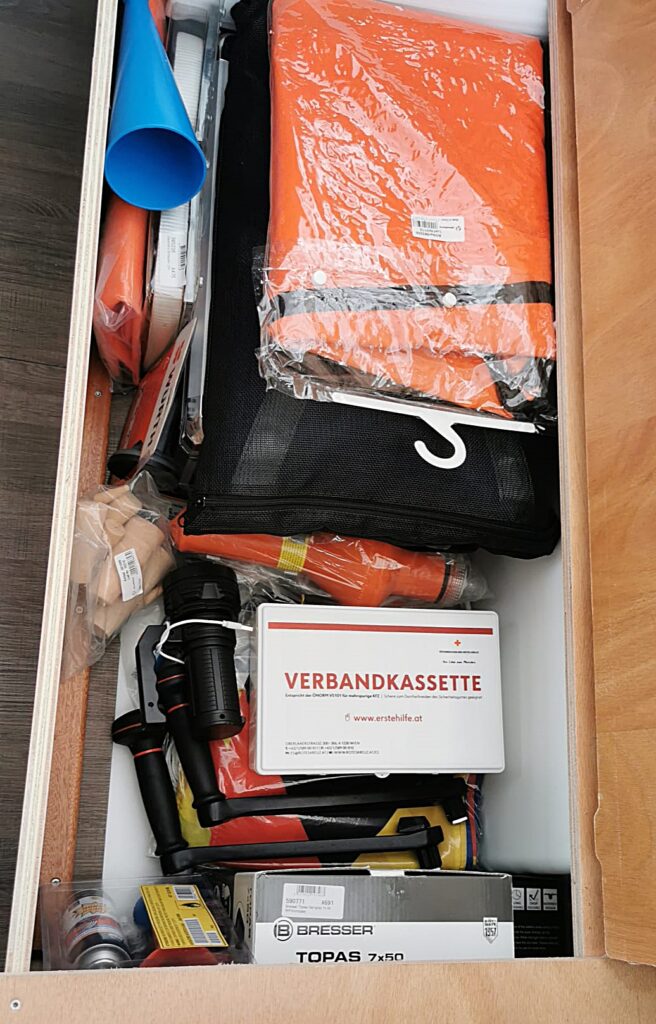 - Erste-Hilfe-Kit / First aid kit: 1 Stk/pcs, Salon, unter der Sitzgelegeneheit am Naviagationstisch / First aid kit is located in salon, beneath sofa next to navigation station.