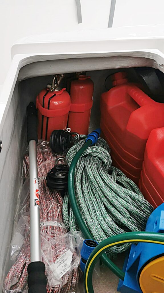- Feuerlöscher / Fire extinguisher: 1 je Kabine + 1 im Salon, 1 in der Backskiste backbord außen / 1 at each cabin, one in salon, one outside in storage portside