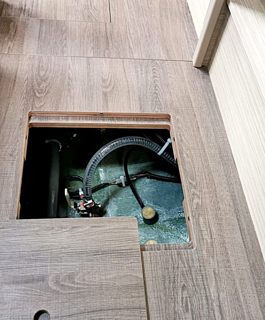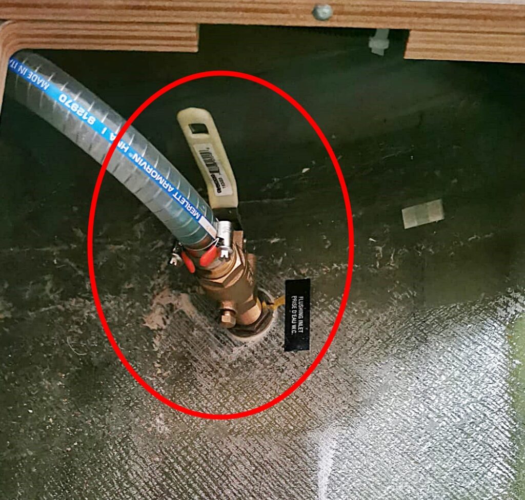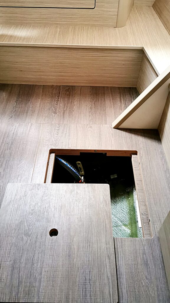 Die Wasserzufuhr für die Toilette Masterkabine befindet sich unter den Bodenpanelen, gegenüber der Toilette. Die Wasserzufuhr für die Küche (Pantry) befindet sich unter dem Bodenpanel vor der Küche. Das Frischwasser-Ventil für die Bugkabine Backbord befindet sich unter dem Bodenpanel vor dem Bett. Für die hintere Kabine befindet sich das Ventil unter dem Bodenpanel am Eingang der Kabine.
