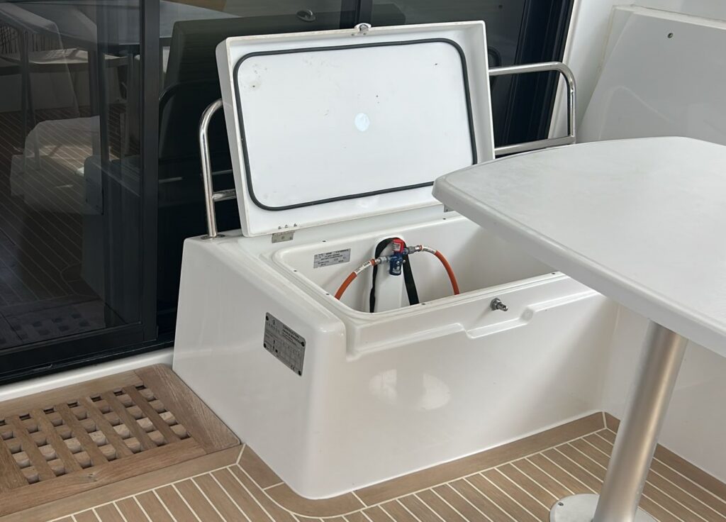 Position tank opening: Tank 1 / Tank 2 each at the stern, above the life raft. Capacity 150 litres each. The fill level of both tanks can be called up on the control panel inside.