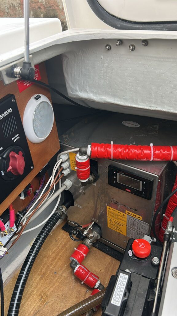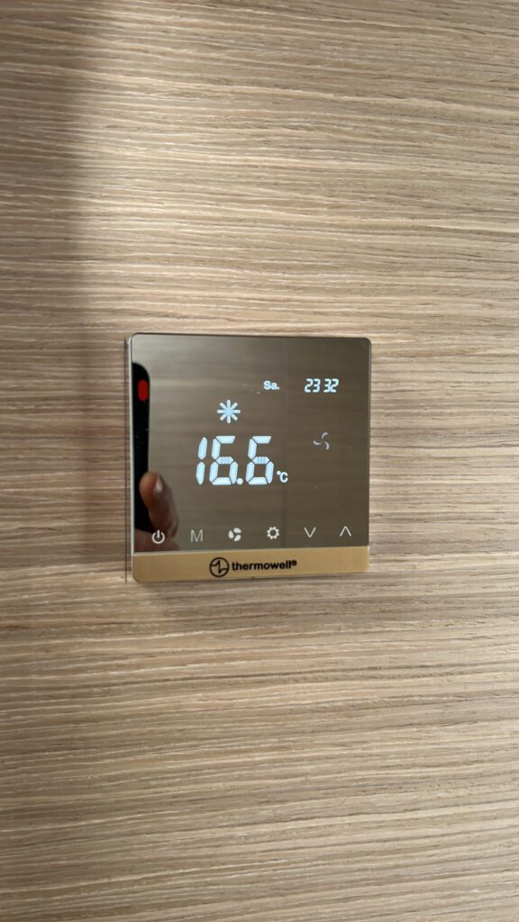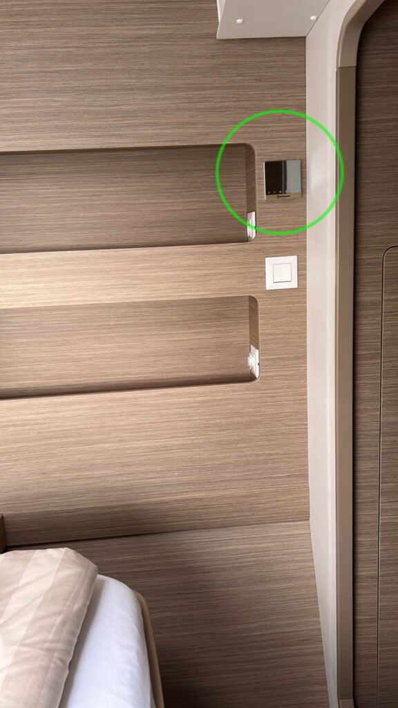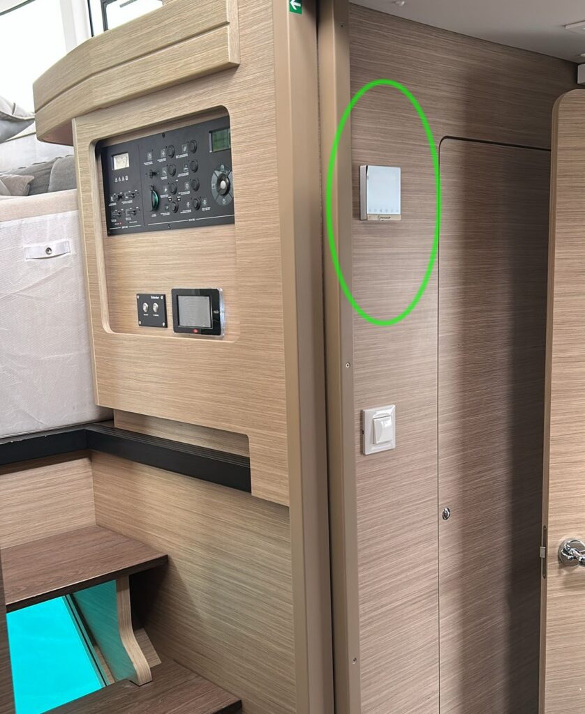 The switches for the air conditioning / heating are located as follows: on the starboard side, to the left of the companionway above the light switch at the height of the electrical panel (owner’s cabin); in the port aft cabin above the light switch; and in the port forward cabin behind the door.